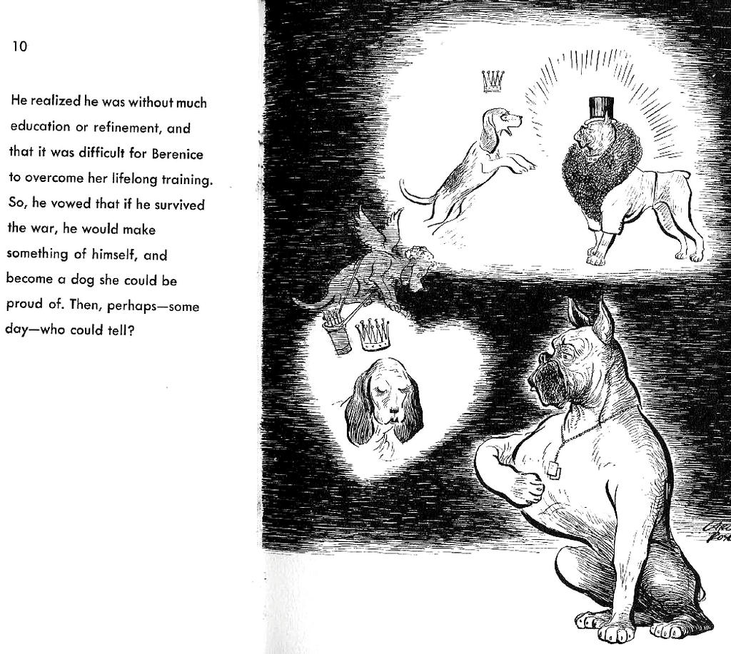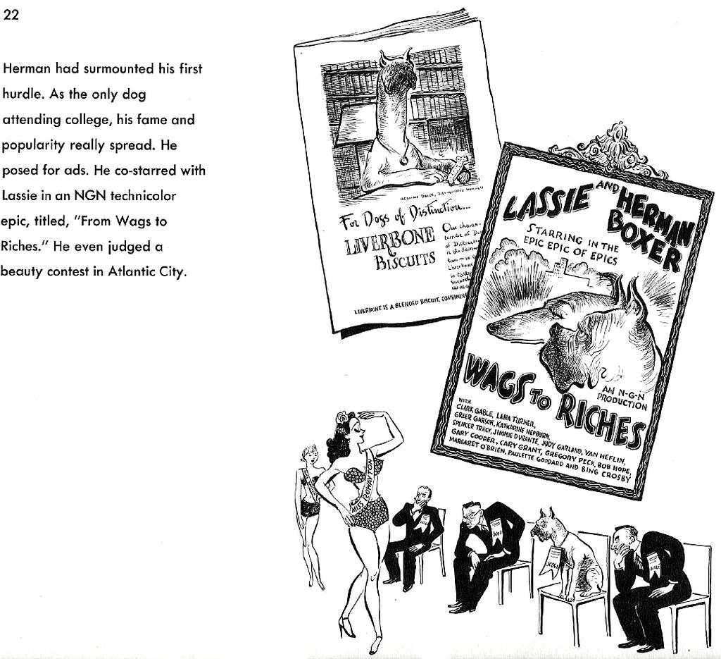 I showed the scans of this excellent book a couple of years go in the original Hairy Green Eyeball blog. Carl Rose's pen and brush drawings perfectly complement Richard Grossman's 1950 fantasy of a returning war veteran, the service dog, Herman Boxer. It's got caricatures of celebrities and politicians of the day, and it's got the Cold War.